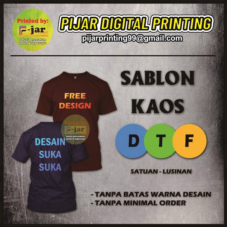 Sablon DTF teknik sablon digital yang menggunakan printer untuk alat mencetak gambar full color sesuai yang di edit di komputer lalu diaplikasikan di kain dengan cara di-press di mesin press kaos dengan suhu tertentu.